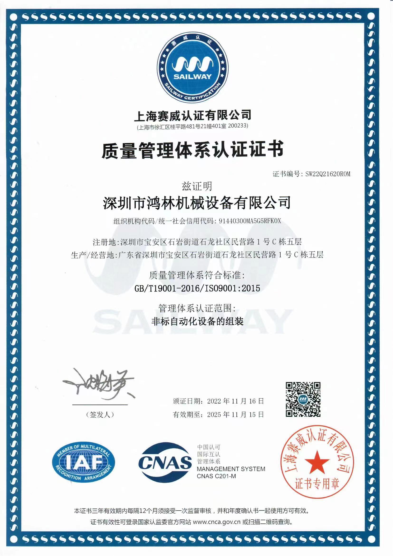 质量管理体系统认证证书