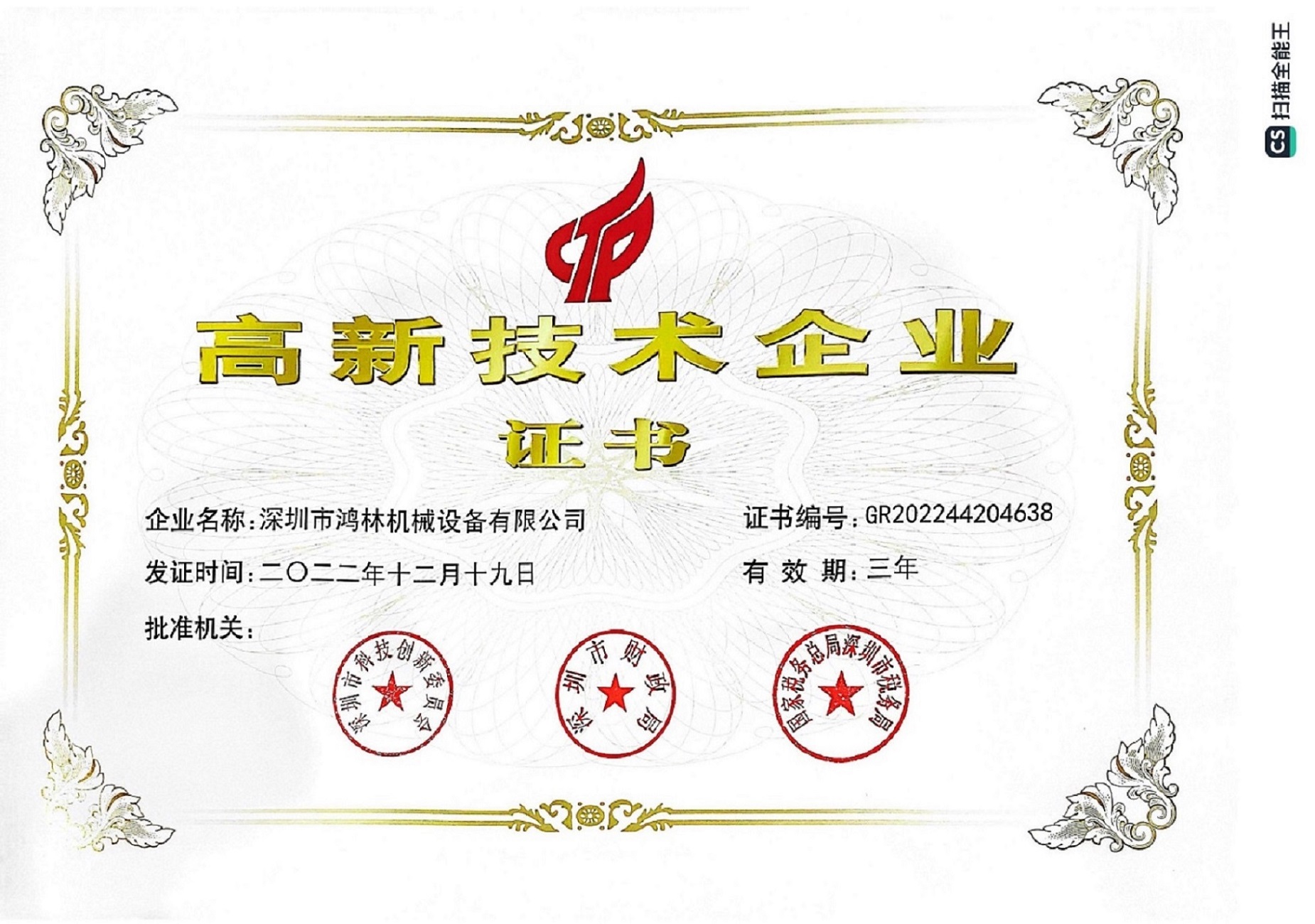 高新技术企业证书